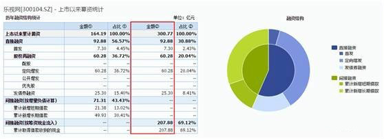 Wind資訊統(tǒng)計(jì)顯示,自2010年上市以來的近七年時(shí)間里,樂視網(wǎng)累計(jì)融資300.77億元,其中直接融資92.89億元,占總?cè)谫Y額30.88%;間接融資207.88億元,占總?cè)谫Y額69.12%。