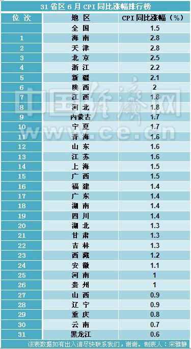 31省區6月CPI同比漲幅排行榜。制表人:宋雅靜