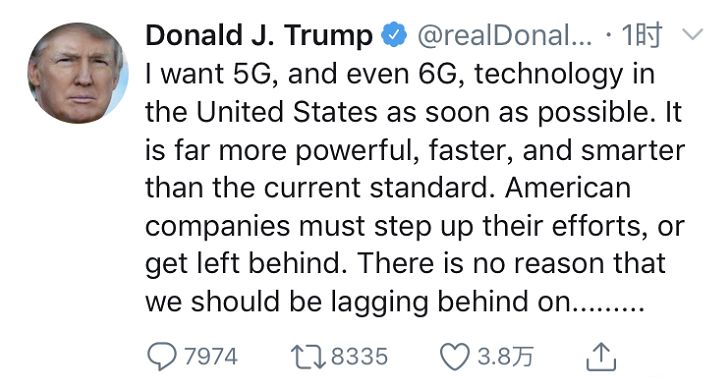 我希望美國盡可能快地發展5G,甚至6G技術,那會比當前的標準更強、更快、更智能。美國公司必須加緊努力,否則就會落后。在那些明顯代表未來的領域,美國沒有被人甩在身后的理由。我希望美國公司能夠通過競爭去獲勝,而不是靠封殺當下更先進的技術。不論在我們從事的哪個領域,美國都必須是領導者,尤其是在令人興奮的科技世界!