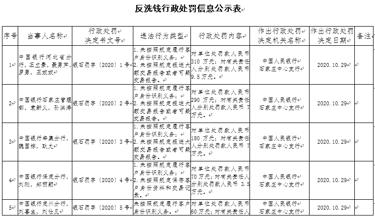 央廣網(wǎng)北京10月30日消息(記者 宓迪)央行石家莊中心支行29日披露的反洗錢行政處罰信息公示表顯示,部分金融機(jī)構(gòu)及有關(guān)負(fù)責(zé)人收到了監(jiān)管部門罰單。
