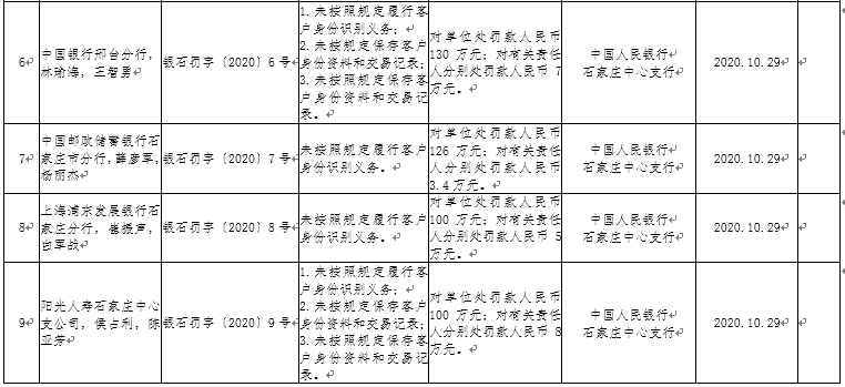 除了上述機(jī)構(gòu),公示表顯示,因中國郵政儲(chǔ)蓄銀行石家莊市分行及有關(guān)負(fù)責(zé)人未按照規(guī)定履行客戶身份識(shí)別義務(wù),監(jiān)管部門對(duì)單位處罰款126萬元,對(duì)兩位有關(guān)責(zé)任人分別處罰款3.4萬元;因上海浦東發(fā)展銀行石家莊分行及有關(guān)負(fù)責(zé)人未按照規(guī)定履行客戶身份識(shí)別義務(wù),監(jiān)管部門對(duì)單位處罰款100萬元,對(duì)兩位有關(guān)責(zé)任人分別處罰款5萬元。