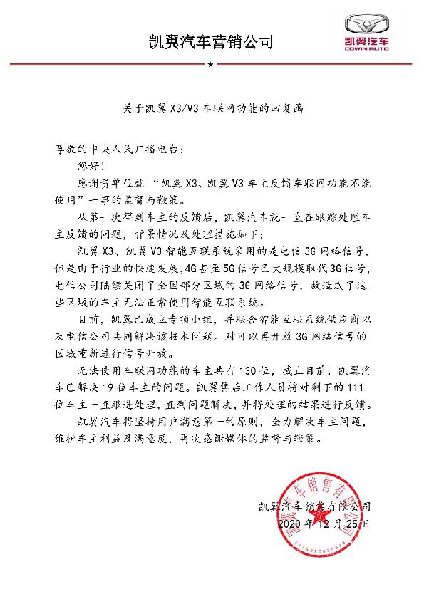 節目播出后,凱翼汽車銷售有限公司發來回復函表示,凱翼X3、凱翼V3智能互聯系統無法正常使用,是由于全國部分區域已經無法正常使用3G網絡信號。