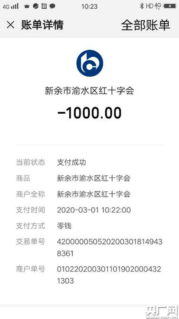 貧困戶胡建華向渝水區紅十字會捐資1000元