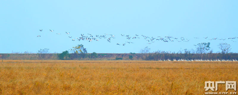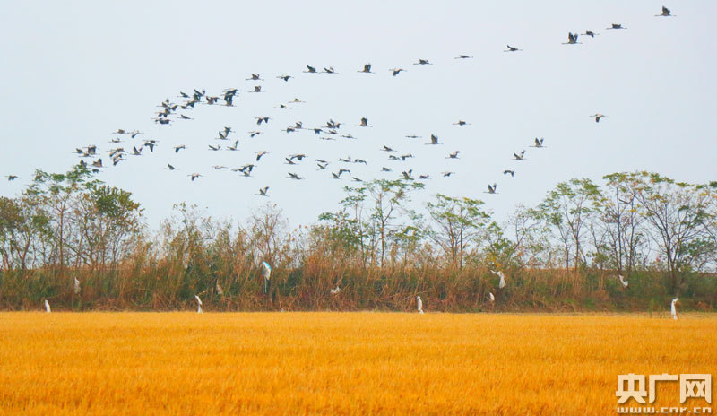 成千上萬只白鶴、白枕鶴、灰鶴在棲息覓食,嬉戲飛舞(央廣網發 通訊員供圖)