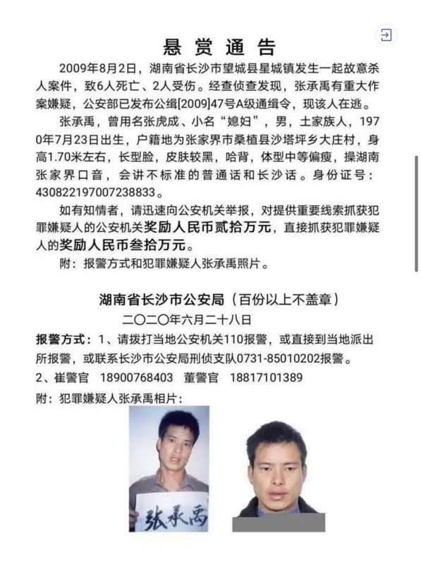 據(jù)2020年6月28日湖南省長(zhǎng)沙市公安局發(fā)布的懸賞公告顯示,張承禹,曾用名張虎成,小名“媳婦”,男,土家族人,1970年7月23日出生,戶籍地為張家界市桑植縣沙塔坪鄉(xiāng)大莊村,身高1.70米左右,長(zhǎng)型臉,皮膚較黑,哈背,體型中等偏瘦,操湖南張家界口音,會(huì)講不標(biāo)準(zhǔn)的普通話和長(zhǎng)沙話。
