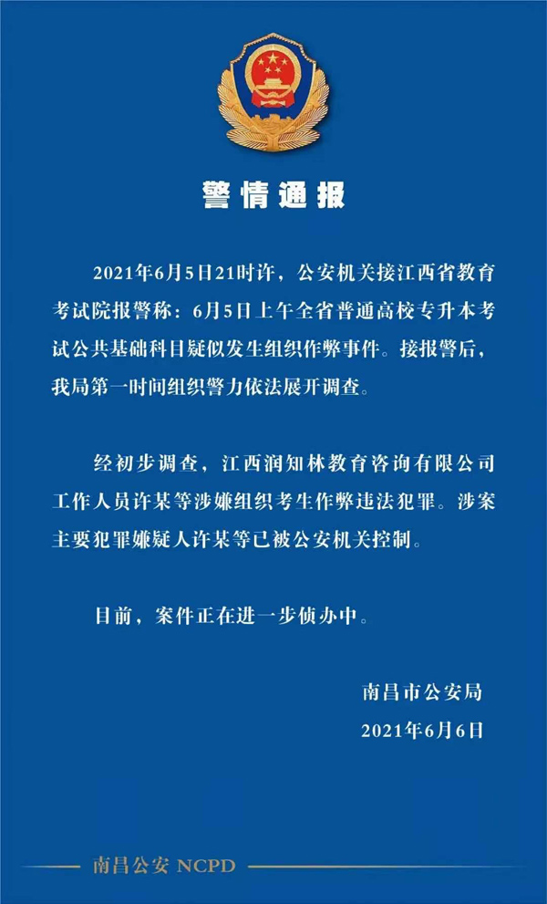 6月5日21時許,南昌市公安局接到江西省教育考試院報警稱:6月5日上午全省普通高校專升本考試公共基礎科目疑似發生組織作弊事件。接報警后,南昌警方第一時間組織警力依法展開調查。經初步調查,江西潤知林教育咨詢有限公司工作人員許某等涉嫌組織考生作弊違法犯罪。涉案主要犯罪嫌疑人許某等已被公安機關控制。目前,案件正在進一步偵辦中。