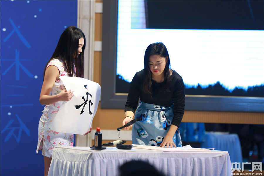 央廣網北京1月12日消息 昨日(11日),由方正手跡發起的“字體手護計劃”首屆年度分享交流會在北京大學舉行。教育部語言文字信息管理司司長田立新、著名書法家葉培貴、中央人民廣播電臺央廣網副總編輯伍剛、方正集團副總裁劉建應邀出席,與現場大學生代表一起分享了有關漢字文化傳承的新形勢、新方法。圖為“字體守護大使”現場書寫“永”字。 -