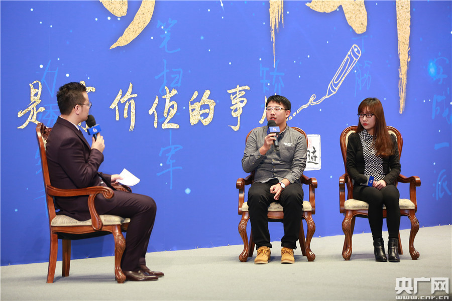 央廣網北京1月12日消息 昨日(11日),由方正手跡發起的“字體手護計劃”首屆年度分享交流會在北京大學舉行。教育部語言文字信息管理司司長田立新、著名書法家葉培貴、中央人民廣播電臺央廣網副總編輯伍剛、方正集團副總裁劉建應邀出席,與現場大學生代表一起分享了有關漢字文化傳承的新形勢、新方法。圖為“字體手護大使”王少雄、王霖分享自己的手下故事。