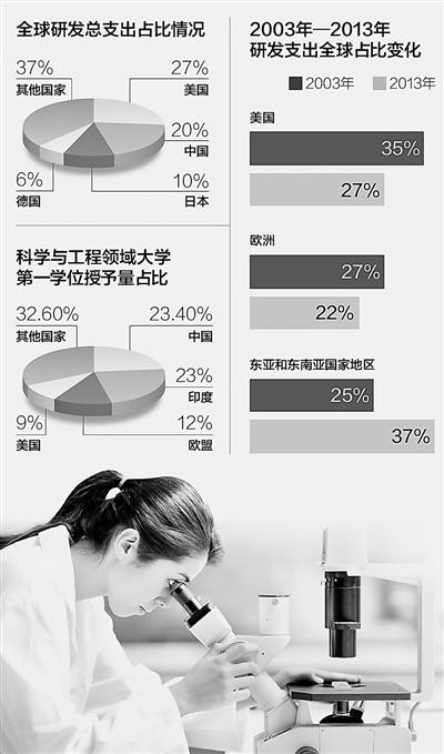 2003年至2013年,東亞和東南亞國家研發支出增長非常迅速,中國最為突出,大約占了全球研發支出增長額的1/3。美歐所占份額則顯著下降,美國從35%下降到27%,歐洲從27%下降到22%。同期,東亞和東南亞國家和地區的占比從25%增長到37%。