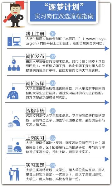 “什么是逐夢計劃啊?”“是一項以在校全日制大學生進機關、進企業、進金融機構、進科研院所、進社會服務機構、進基層開展實習活動為主要內容的社會實踐活動。”團省委城工部相關負責人說,“為推動大學生就業創業,引導大學生通過參與社會實踐和職業體驗增強就業創業能力,團省委、省直機關工委、省教育廳、省人社廳、省國資委、四川銀監局、省學聯繼續聯合開展的本年度逐夢計劃。”