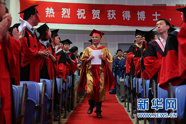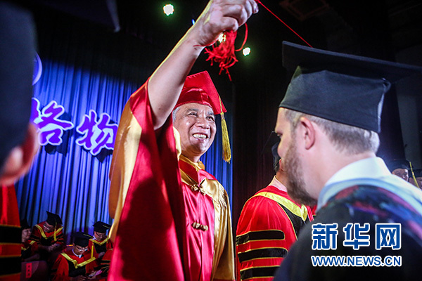 國科大2016年度學(xué)位授予儀式上丁仲禮校長為畢業(yè)生扶正流蘇。
