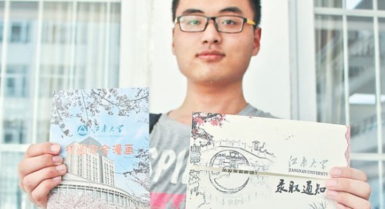 一位準大學生展示了江南大學(分數線,專業設置)的錄取通知書。