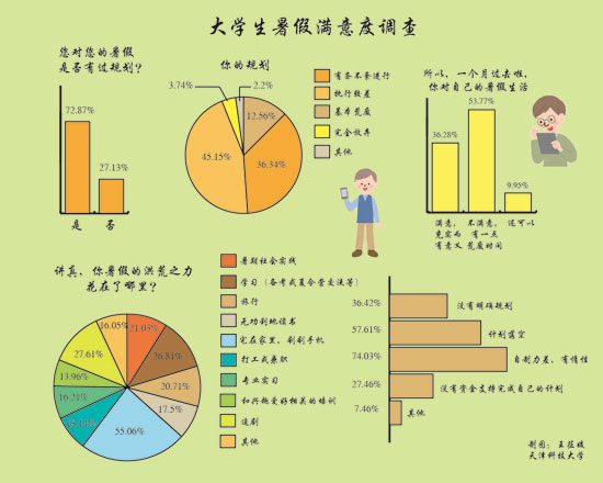 8月,中國高校傳媒聯(lián)盟在來自全國的1937位大學(xué)生中發(fā)起投票,55.06%的大學(xué)生表示暑假基本“‘宅’在家刷手機(jī)度過”。同時,在面向180余所高校的622名大學(xué)生的問卷調(diào)查中,72.87%的大學(xué)生受訪者表示曾對暑假有過規(guī)劃,其中36.34%的規(guī)劃仍在有條不紊地進(jìn)行。36.28%的大學(xué)生受訪者對自己的暑假生活表示滿意,52.73%的大學(xué)生認(rèn)為滿意程度與金錢無關(guān)。