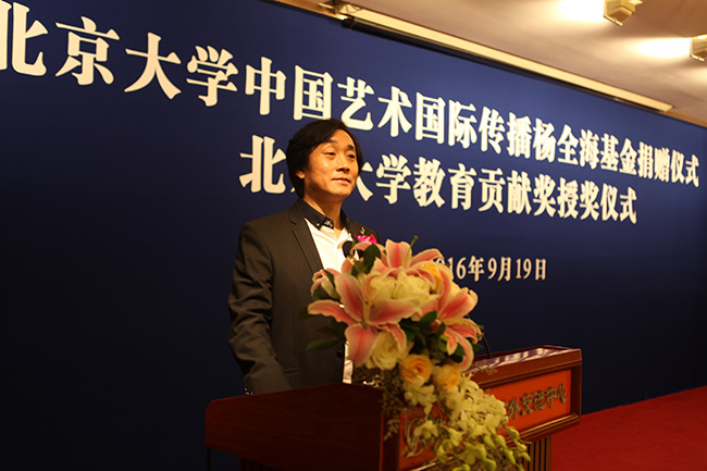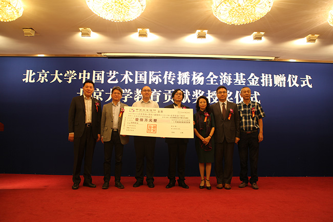 為了推動中國藝術的發(fā)展與傳播,特別是促進中國藝術的國際傳播,北京藝海影杰國際文化傳播中心董事長楊全海博士慷慨捐贈100萬元人民幣,用以資助北京大學藝術學院開展中國藝術國際傳播理論研究和人才培養(yǎng)。北京大學教育基金會胡俊副秘書長代表北京大學接受捐贈并授予楊全海博士“北京大學教育貢獻獎”,用以表彰楊全海博士對教育事業(yè)和公益事業(yè)的貢獻,以及對北大學子和中國藝術國際傳播的深深關愛和關注。