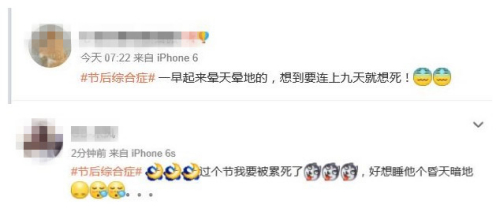 自2015年2月至今,新浪微博“#節后綜合癥#”的話題主頁持續有新帖發布,總閱讀量超過1000萬。節后第一天尚未到來,已經有網友發帖抱怨“一早起來暈天暈地的”“好想睡他個昏天暗地”。