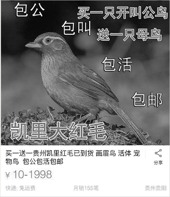 昨天,朋友圈里一篇《‘雙十一’狂歡后的思考》的文章,讓很多人默默放下了快遞,有人開始思考,有人開始跟帖,有人開始行動——這是一位名叫“小小”的網友寫的,她說自己在做一個關于鳥類的課題時,意外在淘寶上搜索發現有不少賣家兜售野生鳥類,比如說伯勞、紅點頦等。