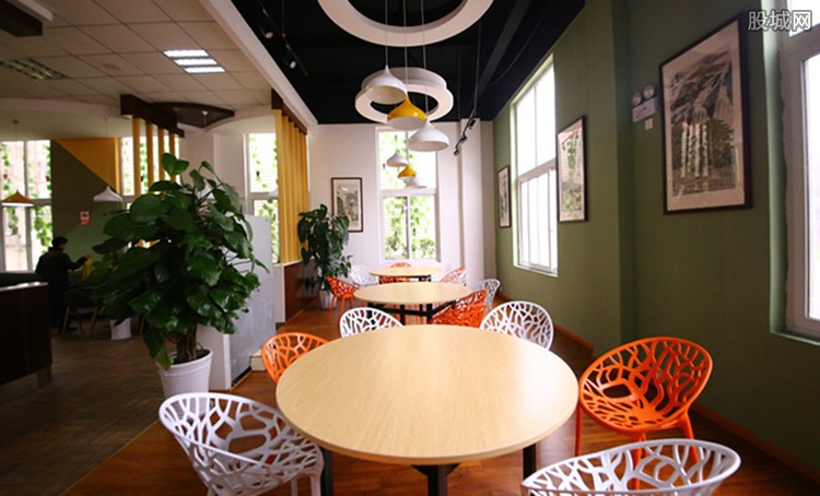 據悉,食堂內部全場以暖色調為主,搭配有墨綠色、白色的桌子和凳子,橘色和白色的吊燈,更有鏤空設計的凳子,文藝且不失藝術感。
