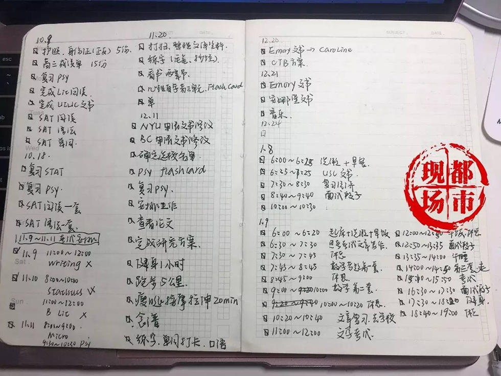 陳子欣展示了她的一個“秘密筆記本”,密密麻麻的寫著每天要做的是,大到復習各種考試,小到練字、健身等,都有著明確的安排。