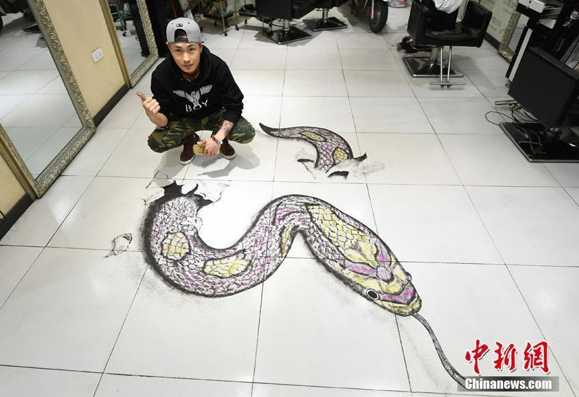 4月18日,吉林市“85后”發型師王小玖用頭發制作3D畫,呼之欲出的3D蛇畫得栩栩如生。據悉,王小玖從2016年7月開始用頭發做畫,至今創作150余幅作品,還在做畫的時候進行網絡直播,與粉絲互動,獲得近十萬粉絲。