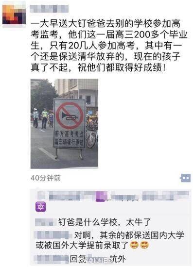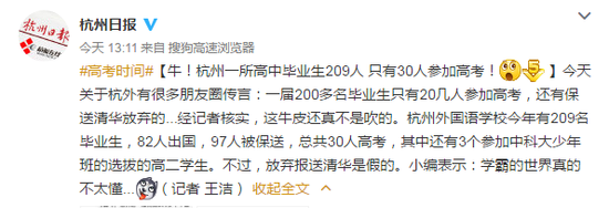 今天關(guān)于杭外有很多朋友圈傳言:一屆200多名畢業(yè)生只有20幾人參加高考,還有保送清華放棄的...經(jīng)記者核實(shí),這牛皮還真不是吹的。杭州外國語學(xué)校今年有209名畢業(yè)生,82人出國,97人被保送,總共30人高考,其中還有3個(gè)參加中科大少年班的選拔的高二學(xué)生。不過,放棄報(bào)送清華是假的。小編表示:學(xué)霸的世界真的不太懂...