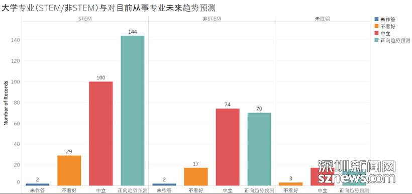 值得注意的是,在大學本科是一本的人中,30.47%(103人)認為學校和專業同等重要,而在大學本科非一本的人中,則有27.94%(38人)的人認為學校和專業都重要,27.94%(38人)的人認為自己努力最重要(38人)。