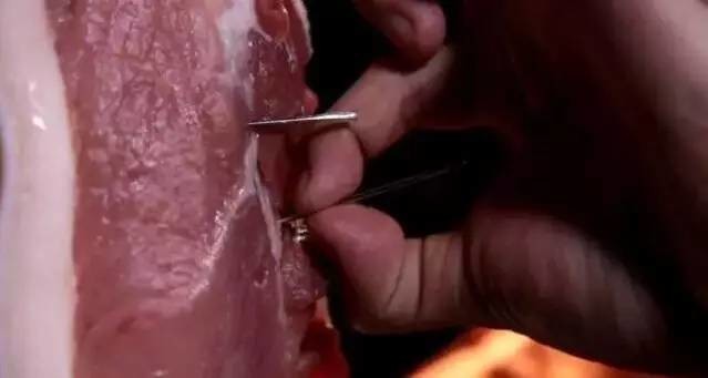 用一塊豬肉來模擬人體,兩枚鋼針深深地插入到豬肉里面,淺的一根針插入豬肉,深的一枚插入達到4公分↓