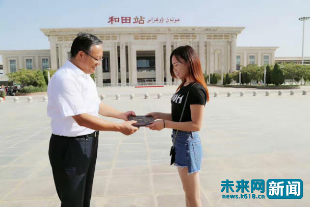 原來,在得知學生無法回學校參加畢業典禮后,校黨委書記李玉鴻感到很遺憾,決定在去和田探親時,親自為她頒發畢業證書。李玉鴻8日早上八點半從昌吉出發,今天十一點到和田站,T9526次列車經過23個多小時行駛2000公里,終于到達和田。下車后,李玉鴻看見學生已經在車站門口等著了。“雖然這件事對學校來講不算大事,但對學生來說,她很開心。”王芳老師說。