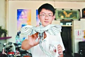 孫洪濤:我不這樣認為,折紙是非常考驗腦力的技術活。它首先是一門藝術,國外也有這門藝術,幾百年前就有人在鉆研它了。這項藝術也衍生出了很多折紙原理,包括折紙數學、折紙物理一類的數學原理。現代折紙有三個要求:不剪切、不粘貼、不重疊,這3個原理使得折紙有了更長足的發展。不管折紙作品簡單還是復雜,它都是由一張紙來完成的。一些復雜的作品,好像一只鳳凰,看起來很復雜,它就是用一整張正方形的紙不用剪切,也不用膠水粘貼,僅僅靠折疊和數學計算而完成的作品。所以,折紙肯定算是特長。我想,大學看中的不是我的折紙,而是折紙過程中體現出的創造能力和藝術能力。