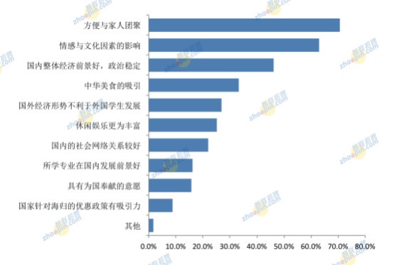 回國發(fā)展原因調(diào)查顯示,“方便與家人團(tuán)聚”和“情感與文化因素的影響”是兩大主因,分別占比70.6%和63%。這與調(diào)查樣本中70.8%的海歸是獨(dú)生子女這一事實(shí)不無關(guān)系。國內(nèi)經(jīng)濟(jì)增長,政治穩(wěn)定;飲食文化、國外經(jīng)濟(jì)形勢不利于外國學(xué)生發(fā)展、國內(nèi)休閑娛樂更為豐富等方面因素比例均超過25%。另外,國內(nèi)社會網(wǎng)絡(luò)關(guān)系、所學(xué)專業(yè)在國內(nèi)發(fā)展前景、奉獻(xiàn)精神等亦是重要原因,分別占22%、16.2%、15.8%。因國家相關(guān)優(yōu)惠政策而歸國的人員僅占8.8%。
