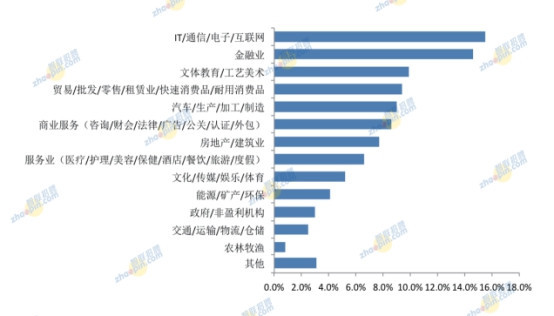在就職行業(yè)方面,位居前五名的依次為IT/通信/電子/互聯(lián)網(wǎng)、金融業(yè)、文體教育/工藝美術(shù)、貿(mào)易/批發(fā)/零售/租賃業(yè)/快速消費(fèi)品/耐用消費(fèi)品、汽車/生產(chǎn)/加工/制造,占比分別為15.5%、14.6%、9.9%、9.4%、9%。此外,能源/礦產(chǎn)/環(huán)保、政府/非盈利機(jī)構(gòu)、交通/運(yùn)輸/物流/倉儲、農(nóng)林牧漁四個行業(yè),占比均在5%以下。