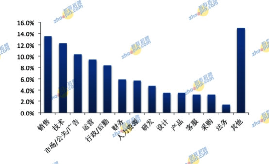 海歸就業(yè)的工作崗位類型分布中,排名前五分別是銷售、技術(shù)、市場/公關(guān)/廣告、運(yùn)營、行政/后勤,占比依次為13.5%、12.3%、10.3%、9.4%、8.4%。其次是財(cái)務(wù)、人力資源和研發(fā),占比分別為5.9%、5.7%和4.7%。設(shè)計(jì)、產(chǎn)品等崗位占比均低于4%。