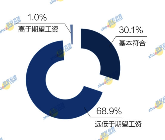 當(dāng)被問及實(shí)際工作收入與個人期望是否一致時,認(rèn)為高于期望的僅為1%,認(rèn)為基本符合的占比30.1%,認(rèn)為遠(yuǎn)低于期望工資的占比68.9%。