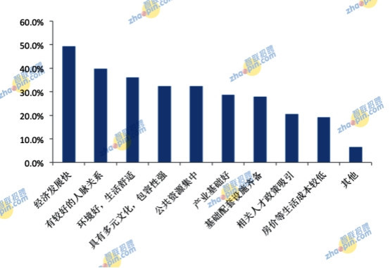 選擇創(chuàng)業(yè)城市的理由呈多樣化特征。其中經(jīng)濟(jì)發(fā)展、人脈關(guān)系、環(huán)境舒適、文化多元包容性強(qiáng)、公共資源集中五類原因排名靠前,占比依次為49.3%、39.7%、36%、32.4%、32.4%。可以看到,城市發(fā)展的軟實(shí)力更受海歸創(chuàng)業(yè)者關(guān)注。其次,產(chǎn)業(yè)基礎(chǔ)、配套設(shè)施、人才政策、房價等生活成本,占比分別為28.7%、27.9%、20.6%、19.1%。