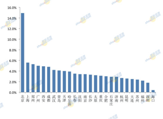 從海歸出生地來看,北京穩(wěn)居首位,且比例遠(yuǎn)遠(yuǎn)超過其它地方。上海、鄭州、廣州、西安、成都居前六位。其它各城市占比依次遞減,但差距微小,且地域涵蓋我國東、中、西各地區(qū)。