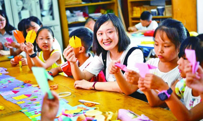 暑假期間,南昌大學的青年志愿者來到江西省南昌市灣里區太平鎮開展“彩虹工程”暑期夏令營活動。一個月時間內,16名志愿者為50多名留守兒童開設了美術、音樂、舞蹈、國學等課程,豐富孩子們的暑期生活。圖為大學生志愿者給太平鎮獅峰學校的孩子們上手工課。新華社發