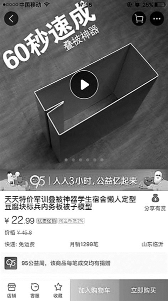 有商家告訴北青報記者,攤開軍訓時用的被子,然后將疊被板放在被子中間,“按照步驟,將被子包裹著疊被板折起來,就能成‘豆腐塊’的形狀,整個過程不超過60秒”。一家月銷量為918筆的商家表示,“這款疊被神器不需要將板子拿出來,用起來很方便,都是軍訓的學生來買。”另一月銷量為1299筆的商家也對北青報記者表示,這款產品的購買者大部分都是正在軍訓的新生。