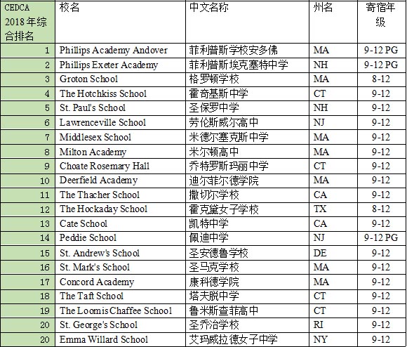 《2018年美國私立寄宿高中綜合排名》部分榜單