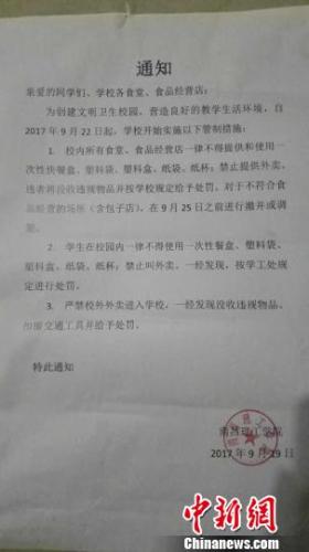 該校在通知內容中要求,學生在校園內一律不得使用一次性餐盒、塑料袋、塑料盒、紙袋、紙杯,并禁止叫外賣,一經發現,按學工處規定進行處罰。同時,也嚴禁校外外賣進入學校,一經發現沒收違規物品、扣留交通工具并給予處罰。