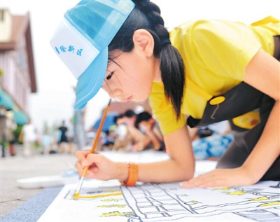 近日,在山東青島,百余名兒童在百米長卷上作畫,描繪自己心目中的家鄉(xiāng)。