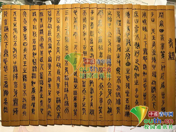 近日,江西師范大學(xué)漢語(yǔ)言文學(xué)專業(yè)的期中作業(yè)走紅網(wǎng)絡(luò),布置作業(yè)的教師要求作業(yè)用小篆在竹簡(jiǎn)上謄抄《孝經(jīng)》。提前抄完的同學(xué)表示:“過程很艱難,2369字一個(gè)字都不能錯(cuò),但收獲也很豐富!”此事一經(jīng)自媒體傳播,立即引起網(wǎng)友熱議,網(wǎng)友紛紛為此點(diǎn)贊打call,并表示想去上這位老師的課!