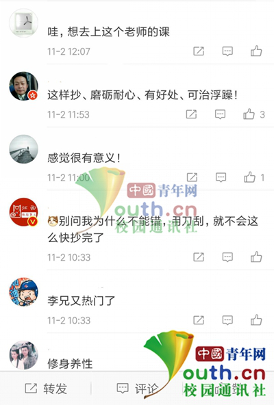 此事一經(jīng)自媒體傳播迅速,在網(wǎng)絡(luò)引發(fā)熱議。很多網(wǎng)友紛紛為此點(diǎn)贊打call。網(wǎng)友“@陳東東”評(píng)論:“超喜歡!”網(wǎng)友“@松”評(píng)論:“這樣抄,磨礪耐心,有好處,克制浮躁。”網(wǎng)友“@智障少女”更是直接表示:“哇,想去上這位老師的課!”