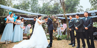 胡喆(右四)和唐瑾(右五)在自家民宿前舉辦婚禮,他們仿佛置身世外桃源,將自己的生活與民宿經營很好地結合在一起。