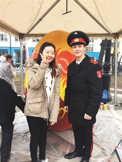 在俄羅斯的節(jié)日慶典活動中,姜若晨(左一)與當(dāng)?shù)剀娦W(xué)生的合影。在她看來,學(xué)子與外國朋友的交往過程中要注重自身形象,傳遞中國微笑。