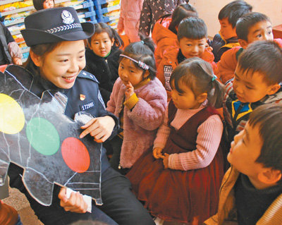 圖為1月15日,派出所民警在下浦幼兒園教小朋友認識“紅綠燈”。