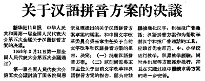 1958年2月12日,《光明日報》1版刊發《關于漢語拼音方案的決議》
