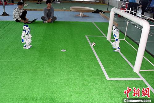 資料圖:2018年3月29日,廈門大學大學生創新創業實踐基地,大學生團隊演示他們研發出的機器人足球。 中新社記者 孫自法 攝