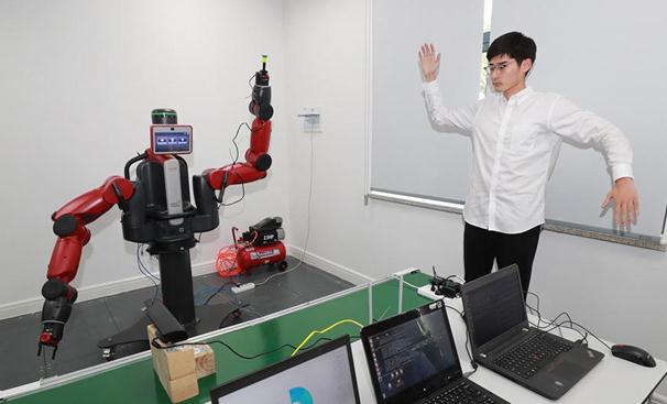 浙江工業大學計算機科學與技術學院(軟件學院)學生朱文成演示實時控制協作機器人。(樊世剛攝)