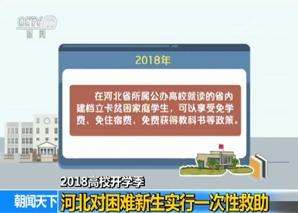 今年,在河北省內就讀的河北省建檔立卡貧困家庭學生,可以享受免學費、免住宿費、免費獲得教科書等政策。從2018年秋季學期開始,河北省還對參加高考并被全日制普通高等院校錄取、具有河北省戶籍的家庭經濟特別困難學生實行一次性救助。一次性救助標準是每生2000-3000元,主要解決大學新生報到的路費、學校助學金發放前的生活費等。
