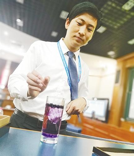 比賽現場,黃俊科拿出一個杯子,倒入礦泉水,放入幾粒黑枸杞,僅用了兩秒鐘,黑枸杞開始釋放出紫色,很快就把這杯水染成了漂亮的透明紫色。記者嘗了一下,還有一股淡淡的甜味。