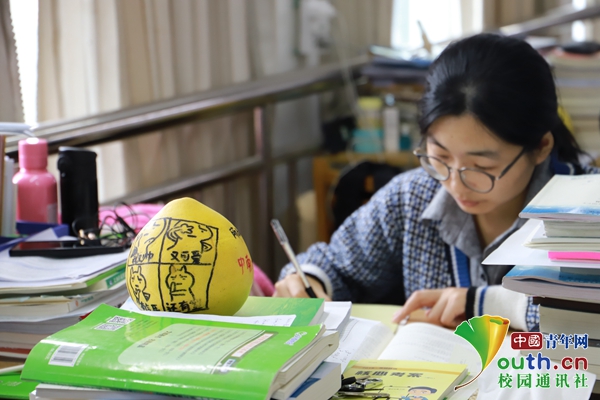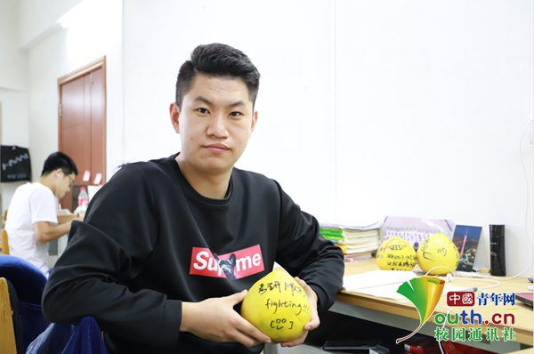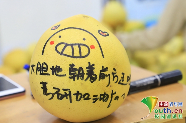 “大膽朝著前方邁進,考研加油鴨。”“你是最胖的噠!相信自己”30多名學生干部拿起成堆的柚子,利用課余時間在上面畫上流行的趣味表情,并上面寫上了征集到的祝福,經一周加工完畢。